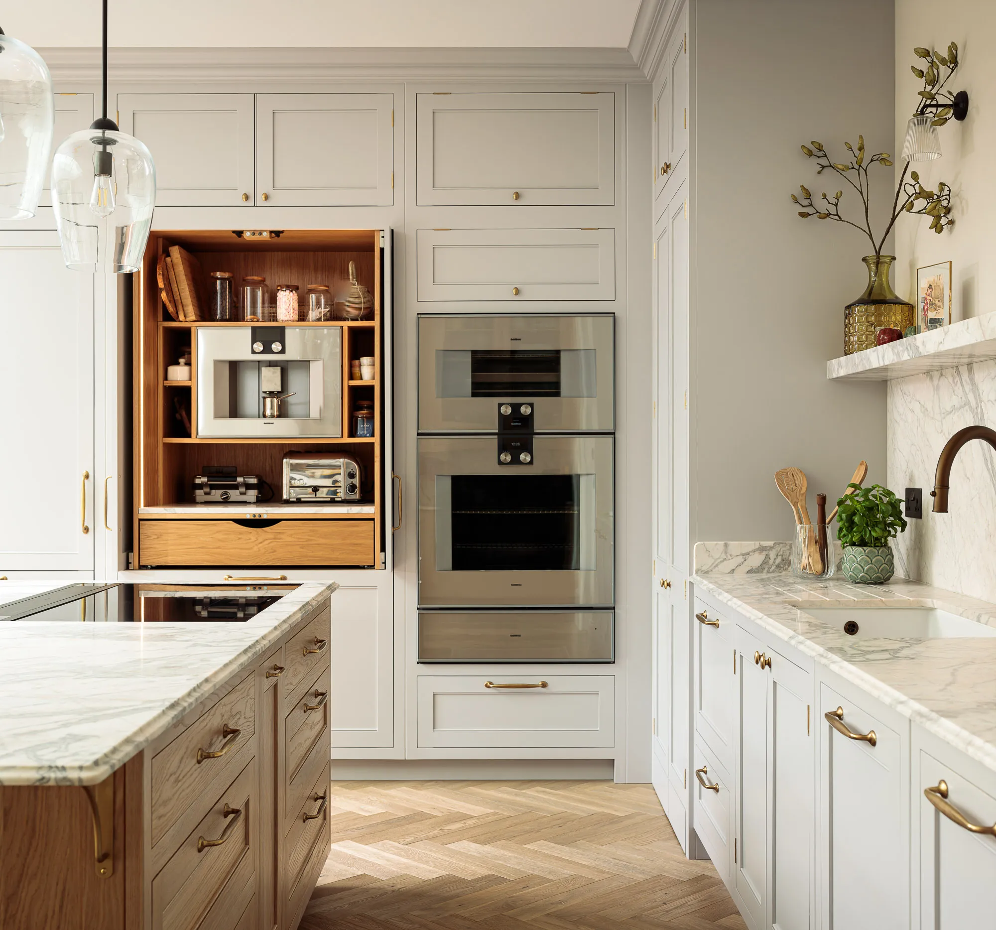 On the ground floor, striking Crittall glazing frames views of the landscaped garden and draws daylight deep into the plan. The arrangement includes a welcoming entrance hall, a cosy living room, a cloakroom, a boot room, and a highly functional kitchen with a discreet walk-in pantry — all designed for everyday ease without compromising elegance.