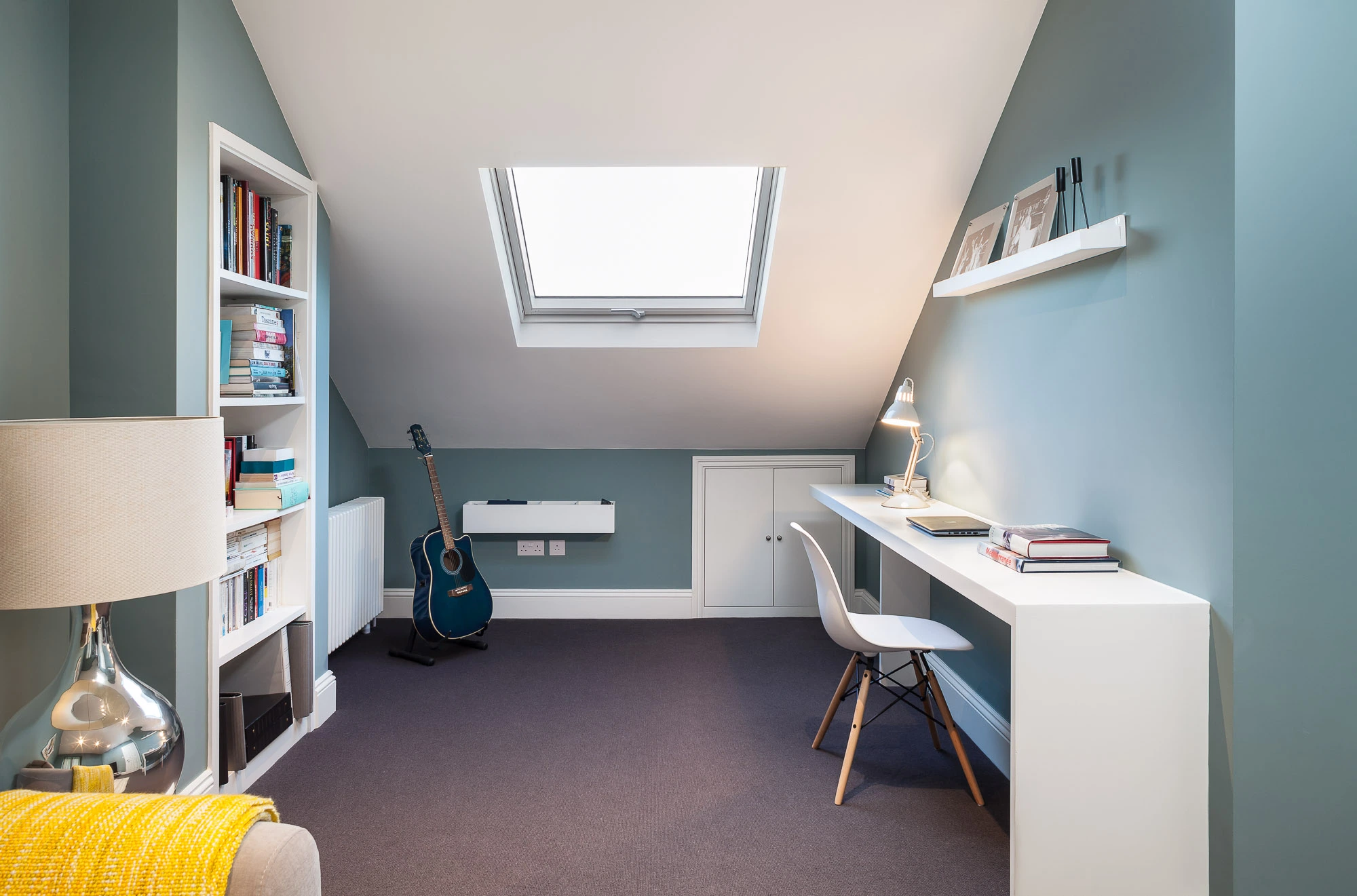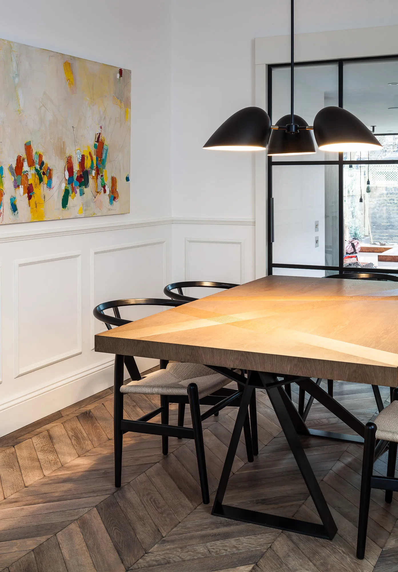 Upstairs, the loft has been transformed into a media room, providing a cosy and versatile retreat. The combination of vintage chevron flooring, Parisian-style panelling and modern industrial details ensures that Felden House feels both contemporary and timeless, elegant yet practical.