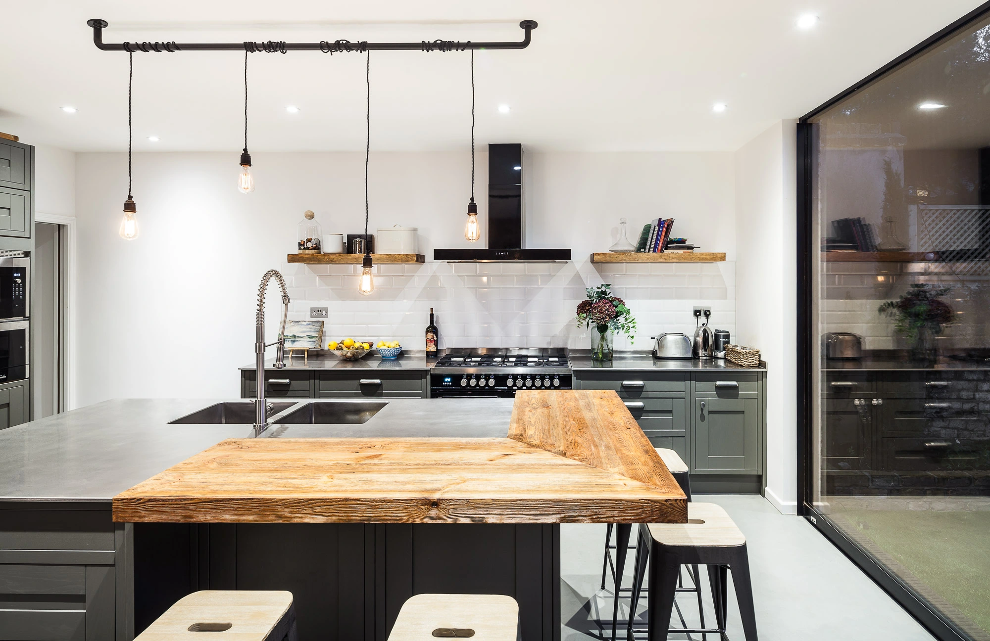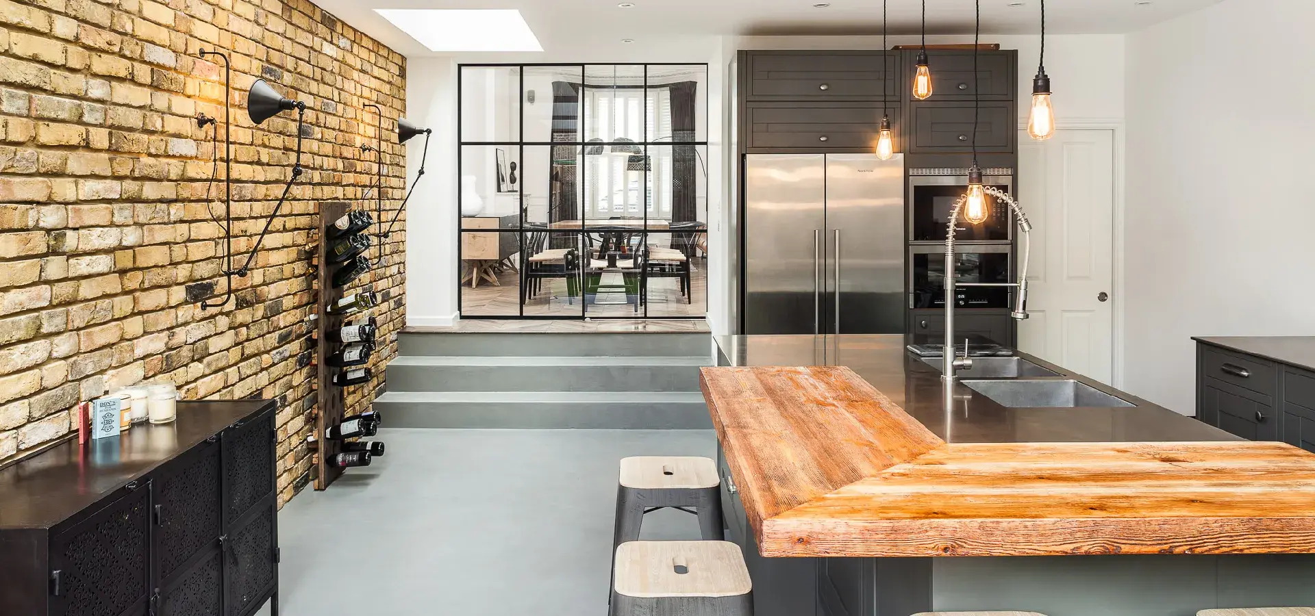 The kitchen is the heart of the house, designed with an industrial edge. Resin concrete floors, reclaimed yellow brickwork, stainless steel worktops and a raw wood bar create a striking material palette that is robust yet stylish. A sliding Crittall-effect door separates the two main living spaces, providing flexibility while adding bold architectural character.