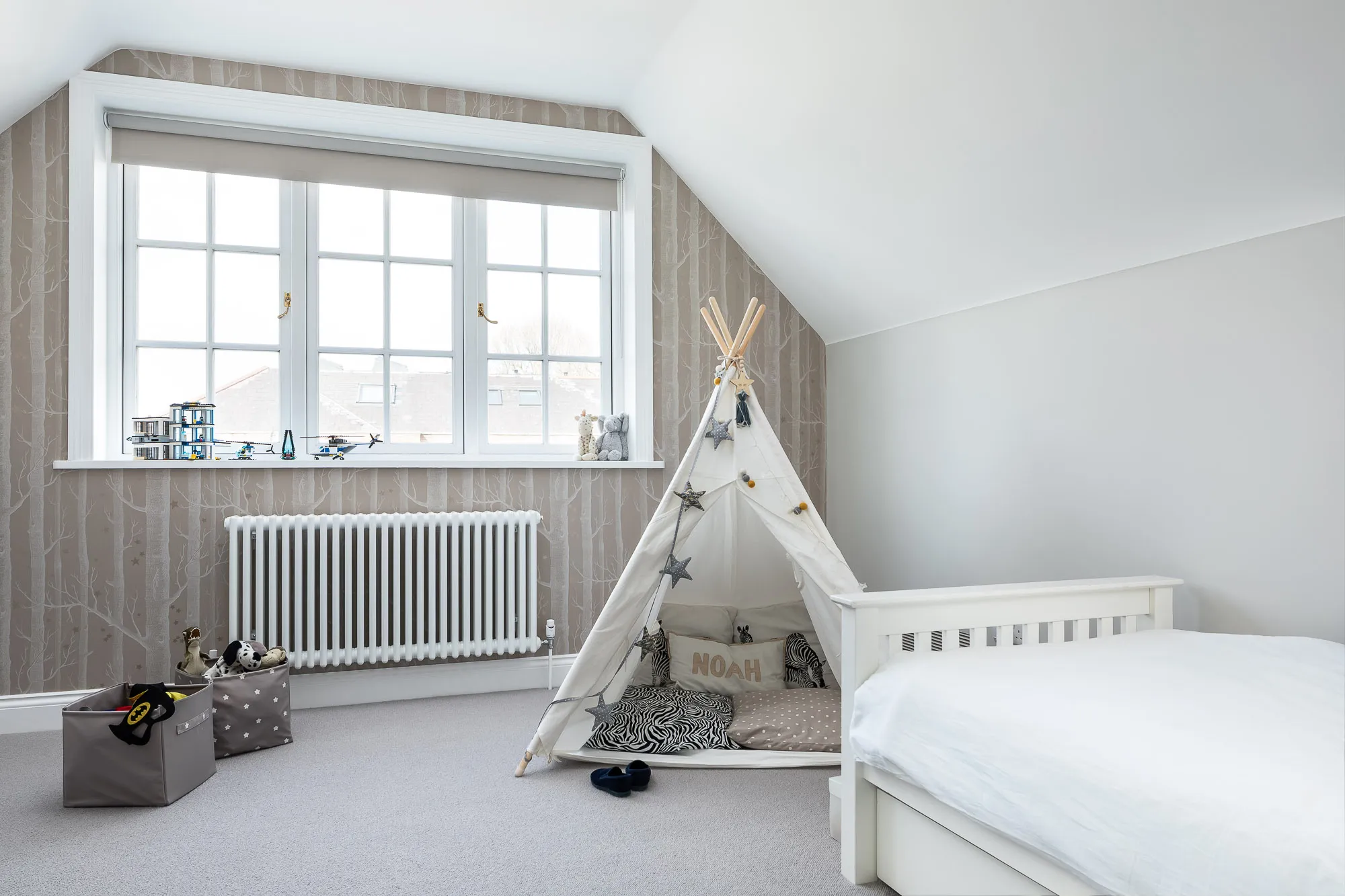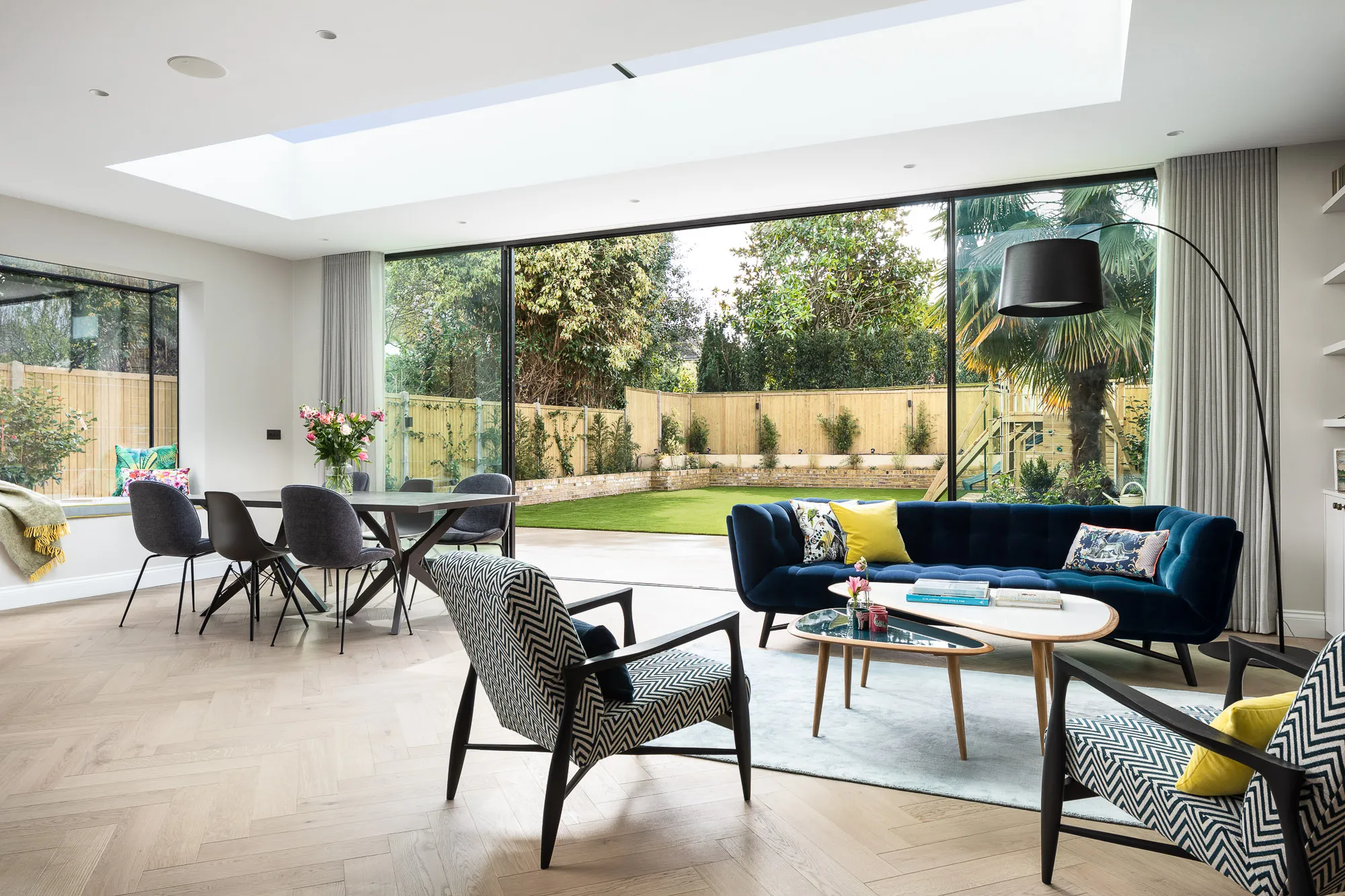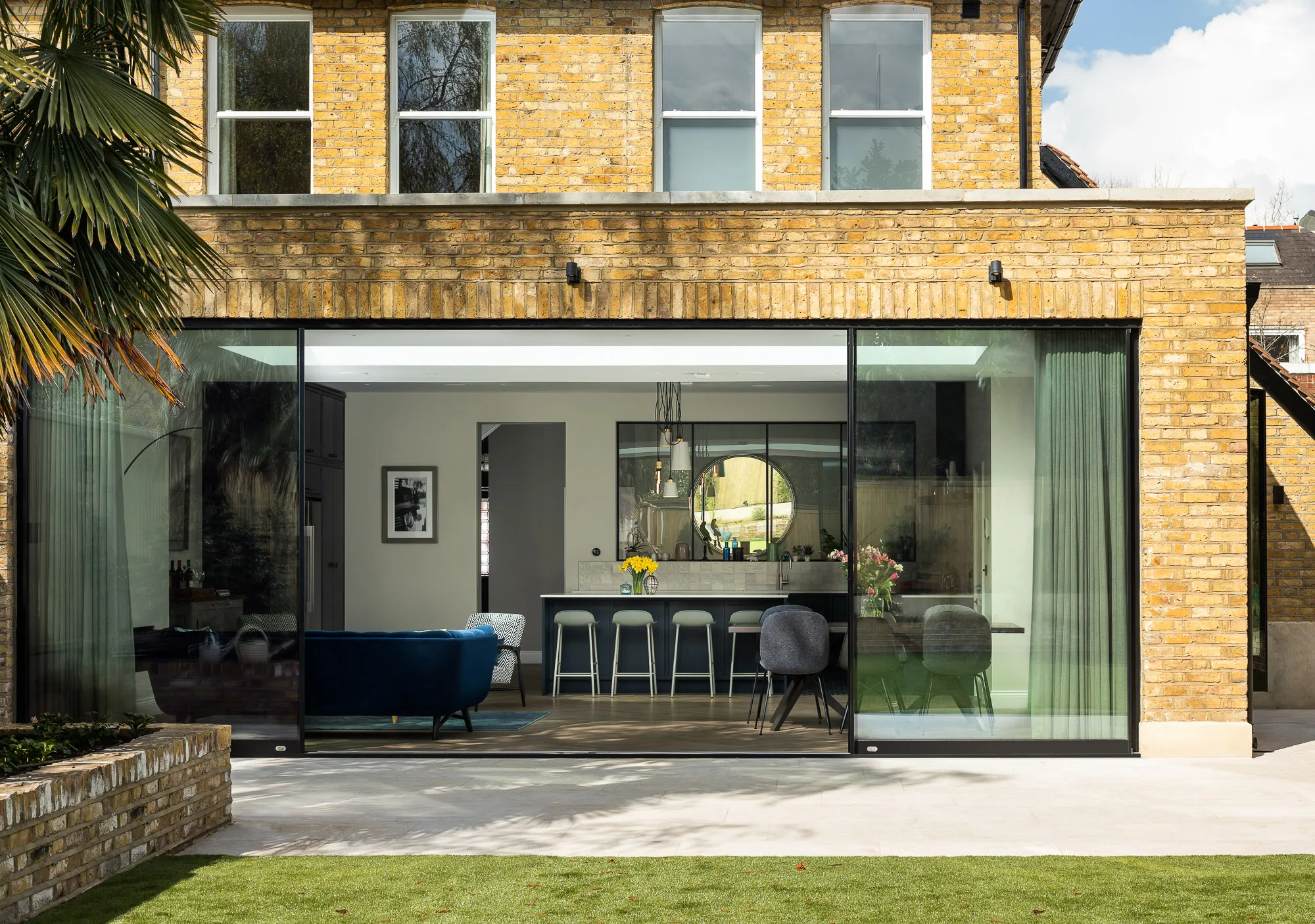 At the rear, an exceptional extension opens the ground floor into a 65 sqm living, kitchen and dining space. Over 7-metre-wide sliding doors frame views of the garden, while a distinctive oriel window on the side captures daylight and adds architectural presence. The loft was transformed with a striking dormer — a first for the local planning authority — unlocking valuable new space.