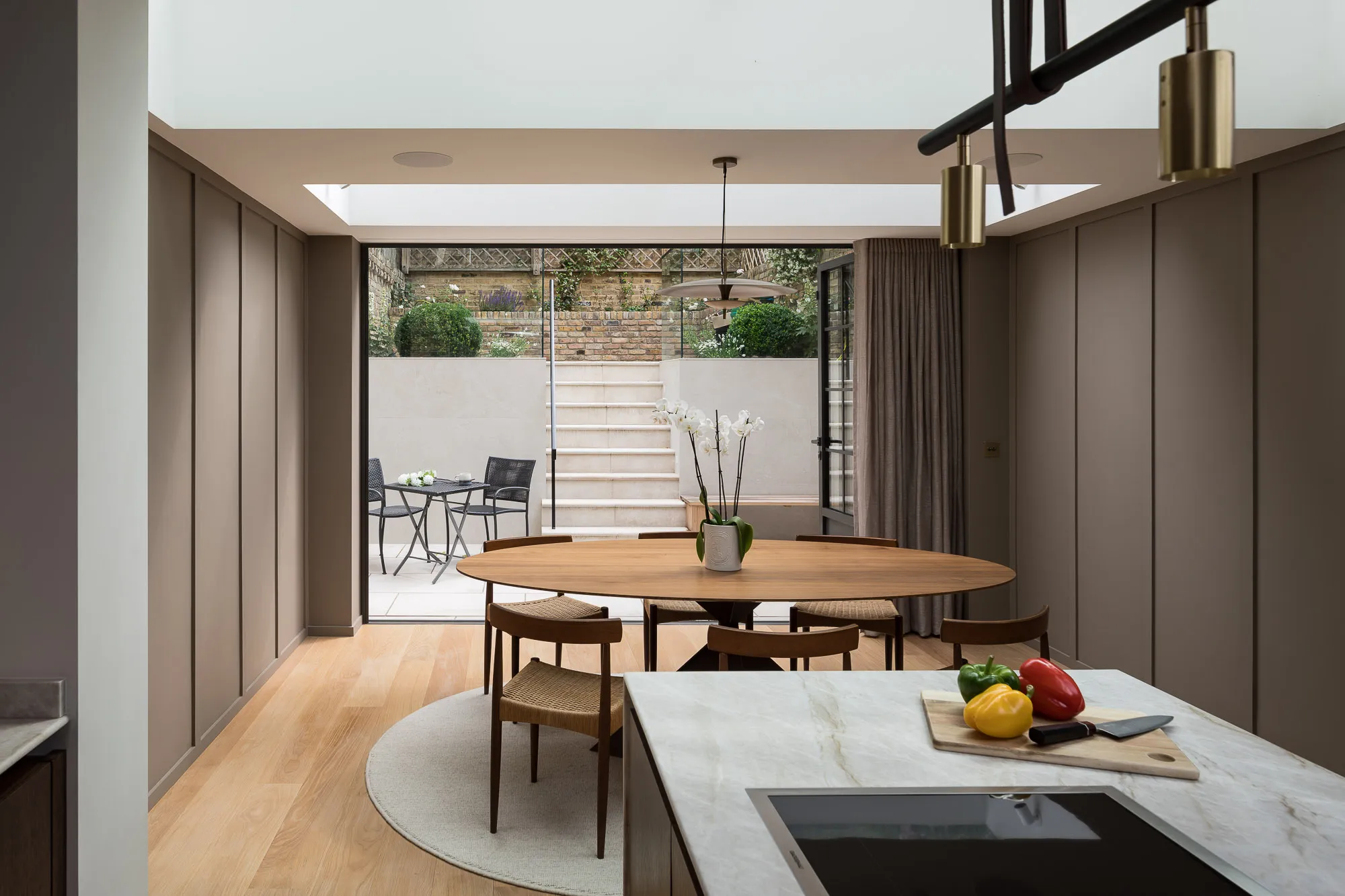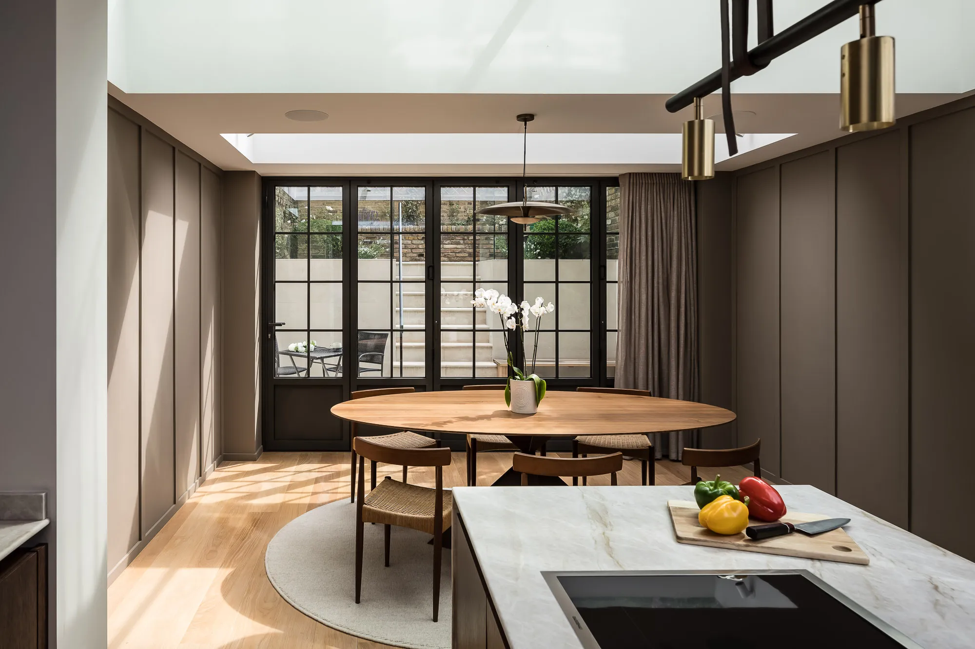 The design centres on maximising natural light and creating open, welcoming interiors. The existing lower ground floor rear extension was replaced with a carefully considered scheme, including a floor lowered by 320mm, sleek strengthened flat roof lights, and elegant Crittall-style aluminium French doors and windows. These interventions not only brought daylight into previously dark, impractical rooms but also respected the property’s heritage, blending seamlessly with the conservation area’s architectural character.