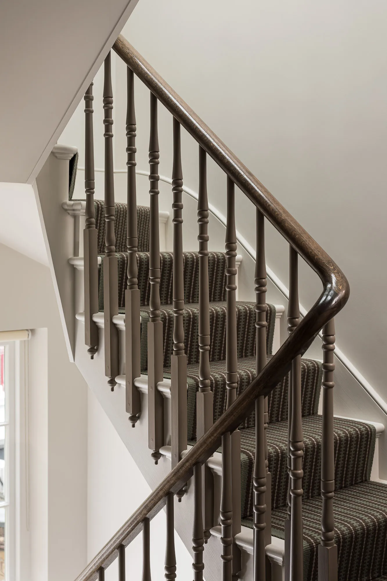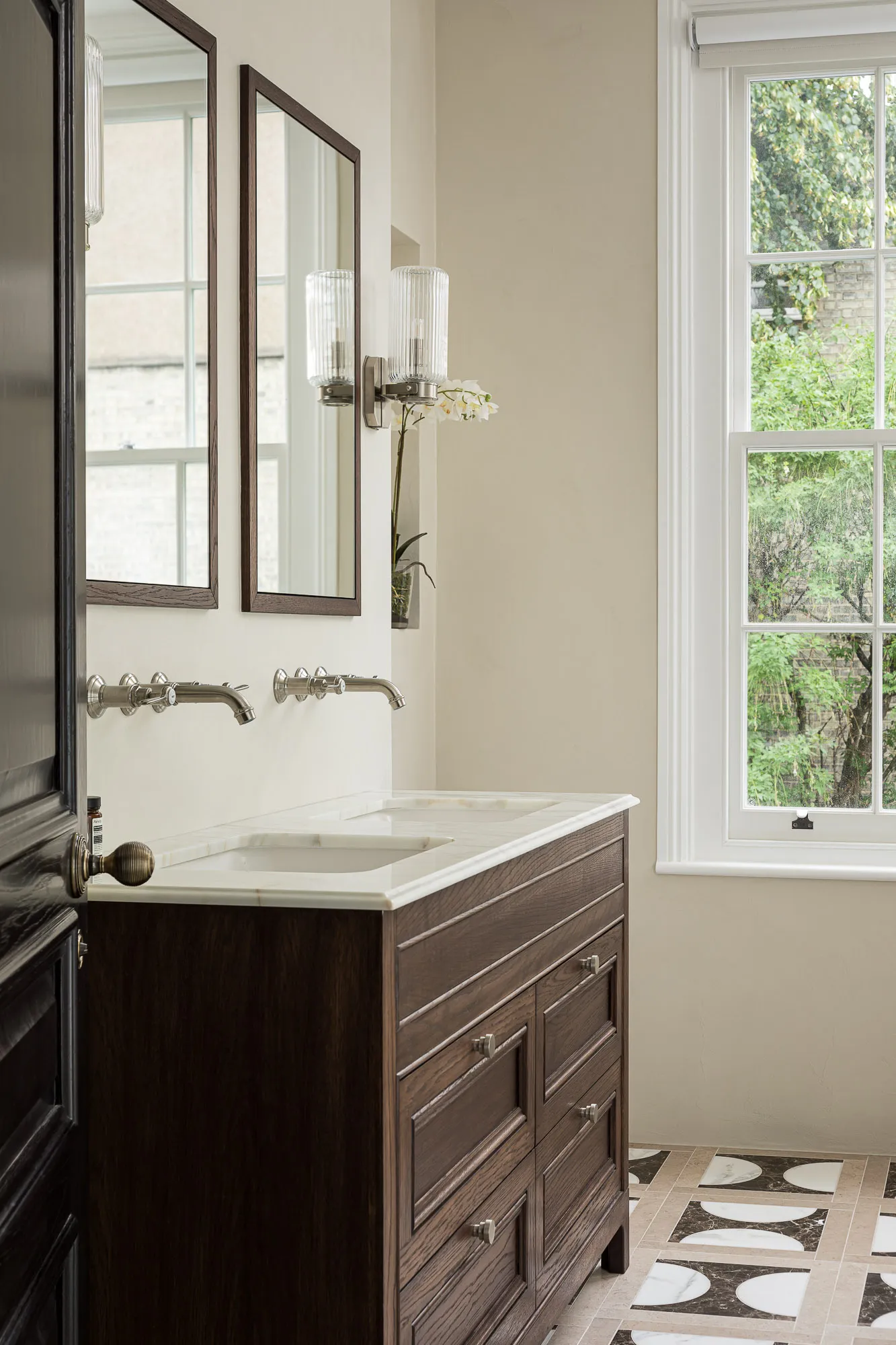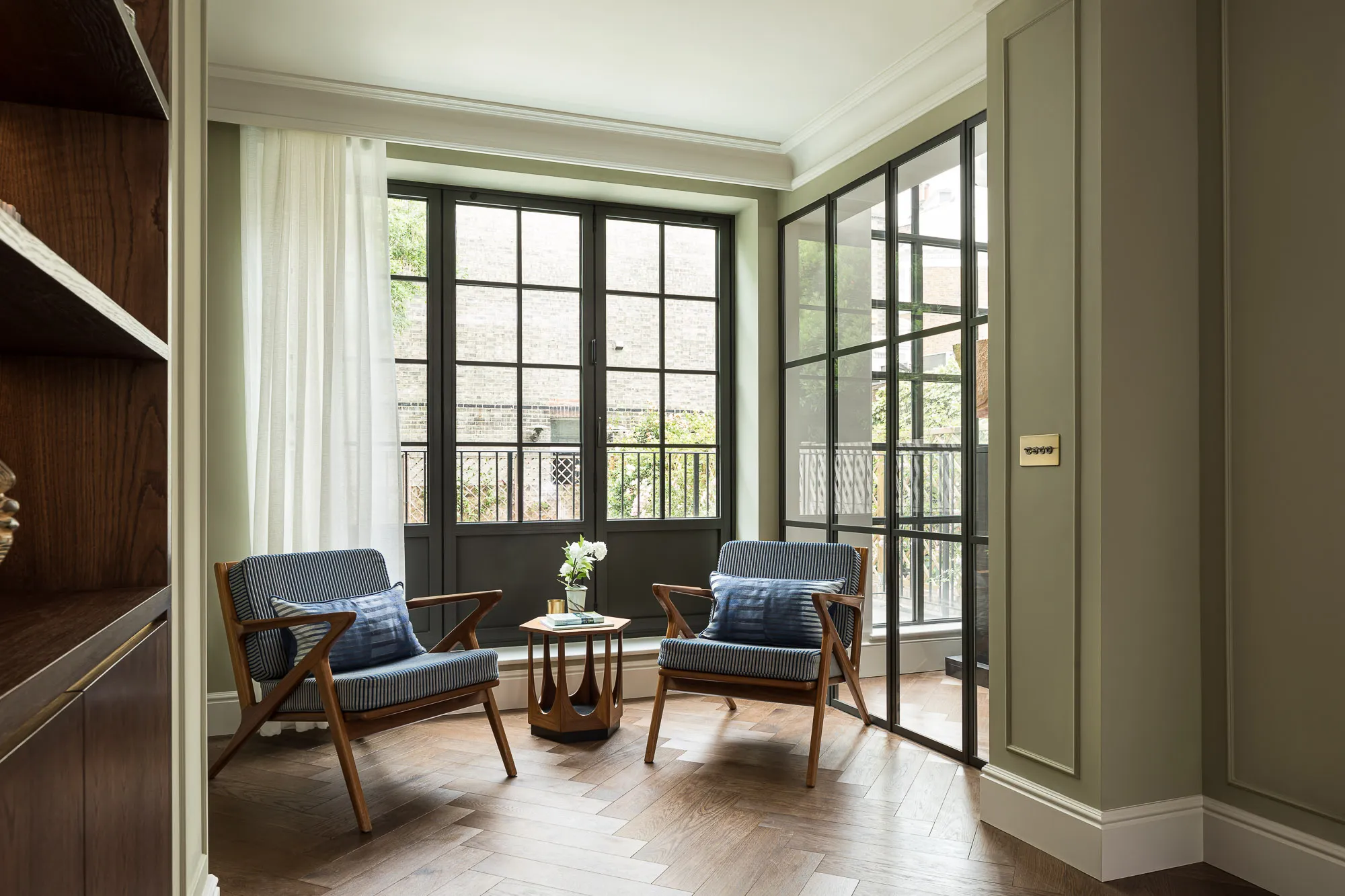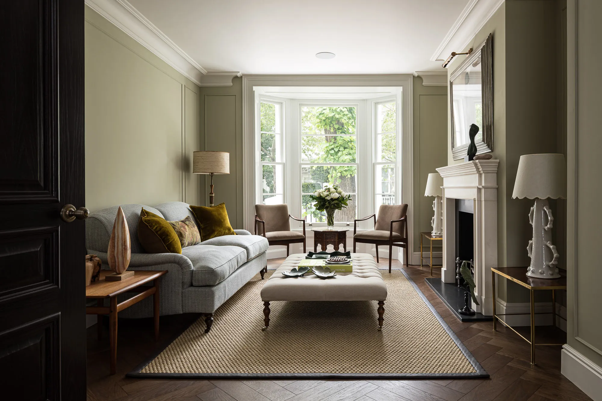 A striking double-height space was introduced at the back of the ground floor with a custom Crittall-style fixed black window, bathing the hallways, stairwell and adjoining reception rooms in natural light. The result is a sense of openness and warmth, rare for homes in central London.