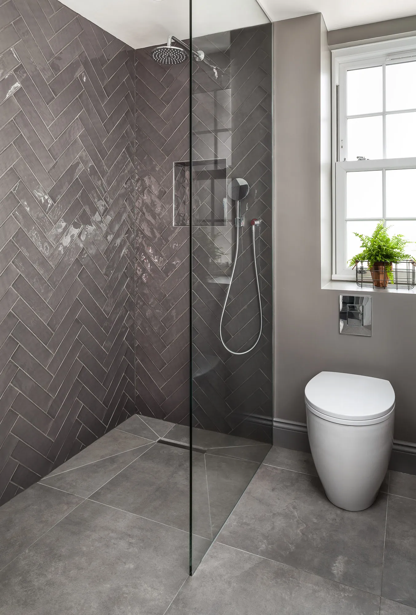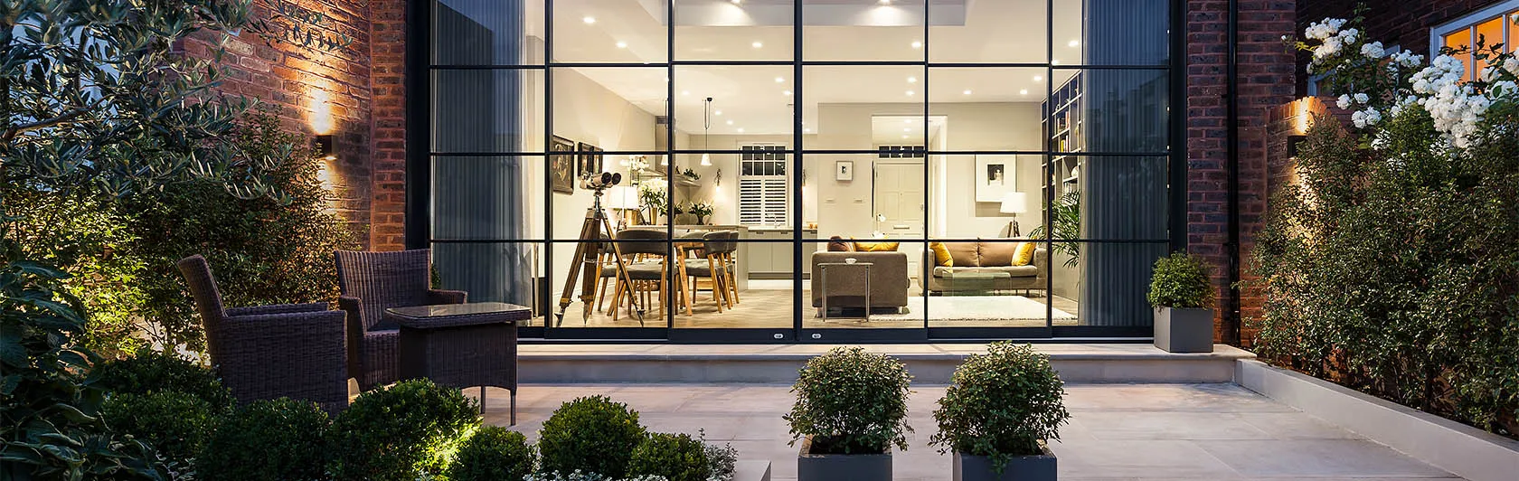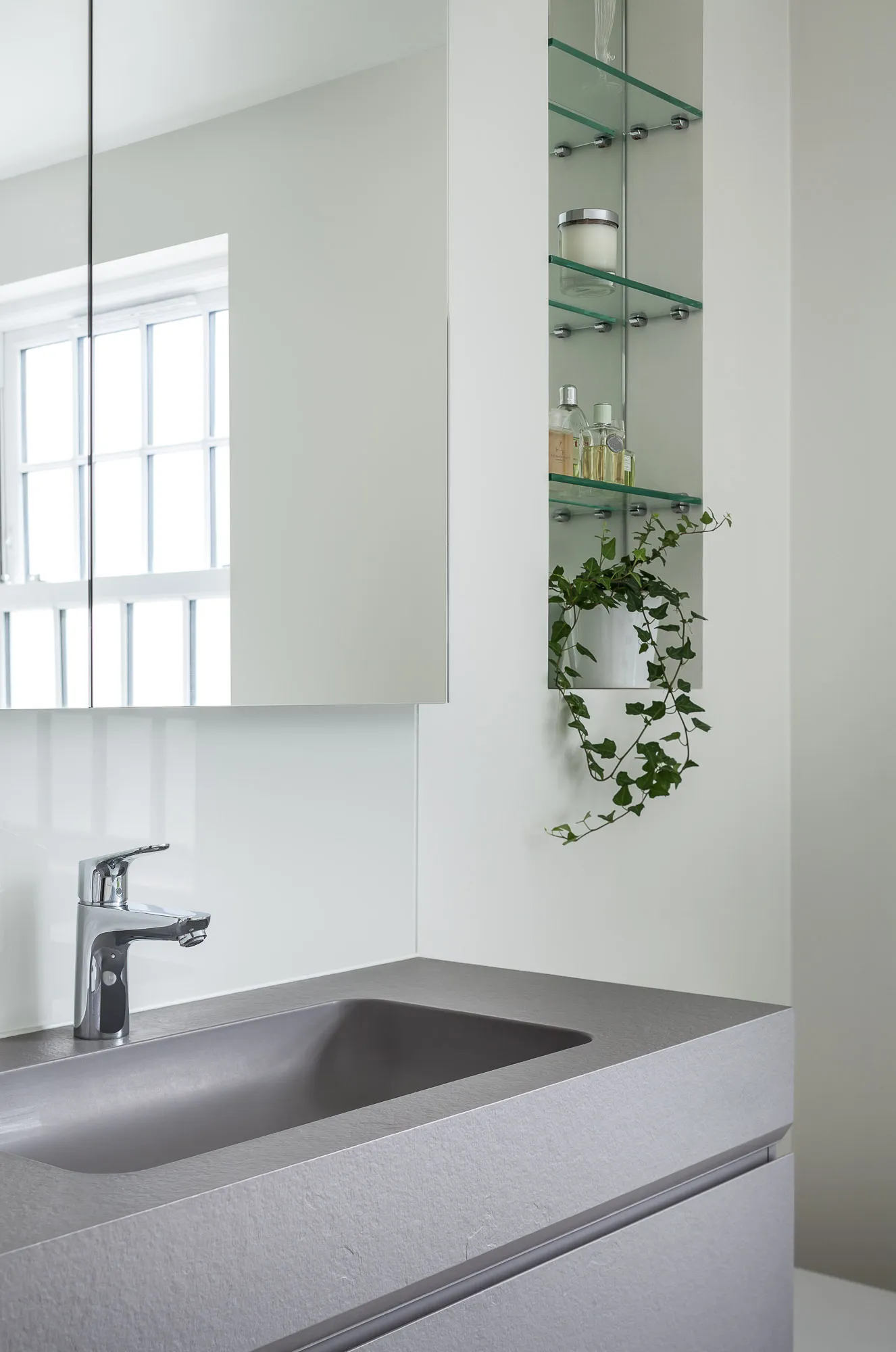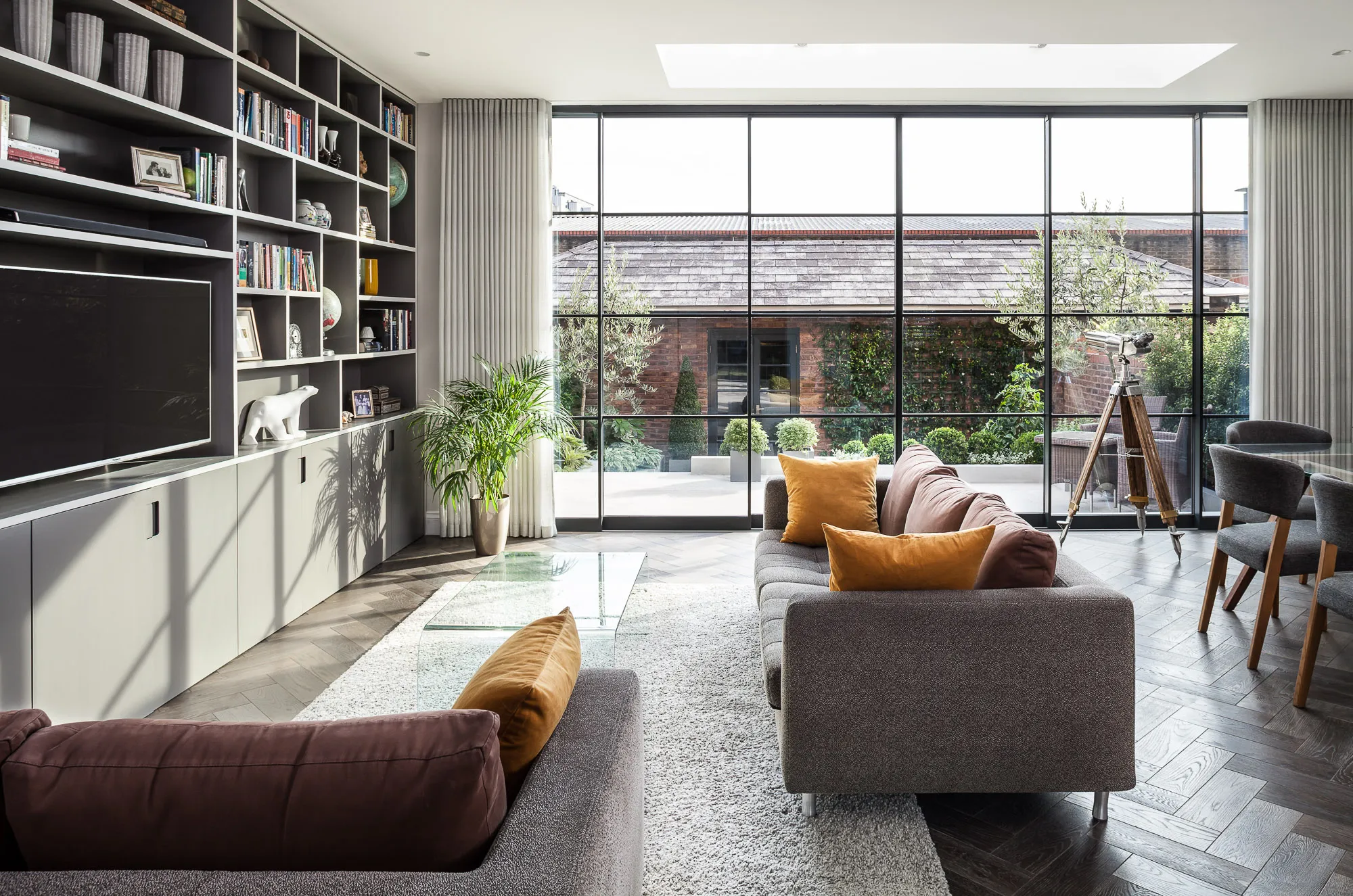 At the heart of the house is a new open-plan kitchen and living space. Floor-to-ceiling Crittall-style sliding doors open directly onto a landscaped rear garden, blurring the boundaries between indoors and outdoors. The garden was designed by EMR as a green retreat, with planting that softens the architecture and a carefully considered transition leading to the garage, making it as practical as it is inviting.