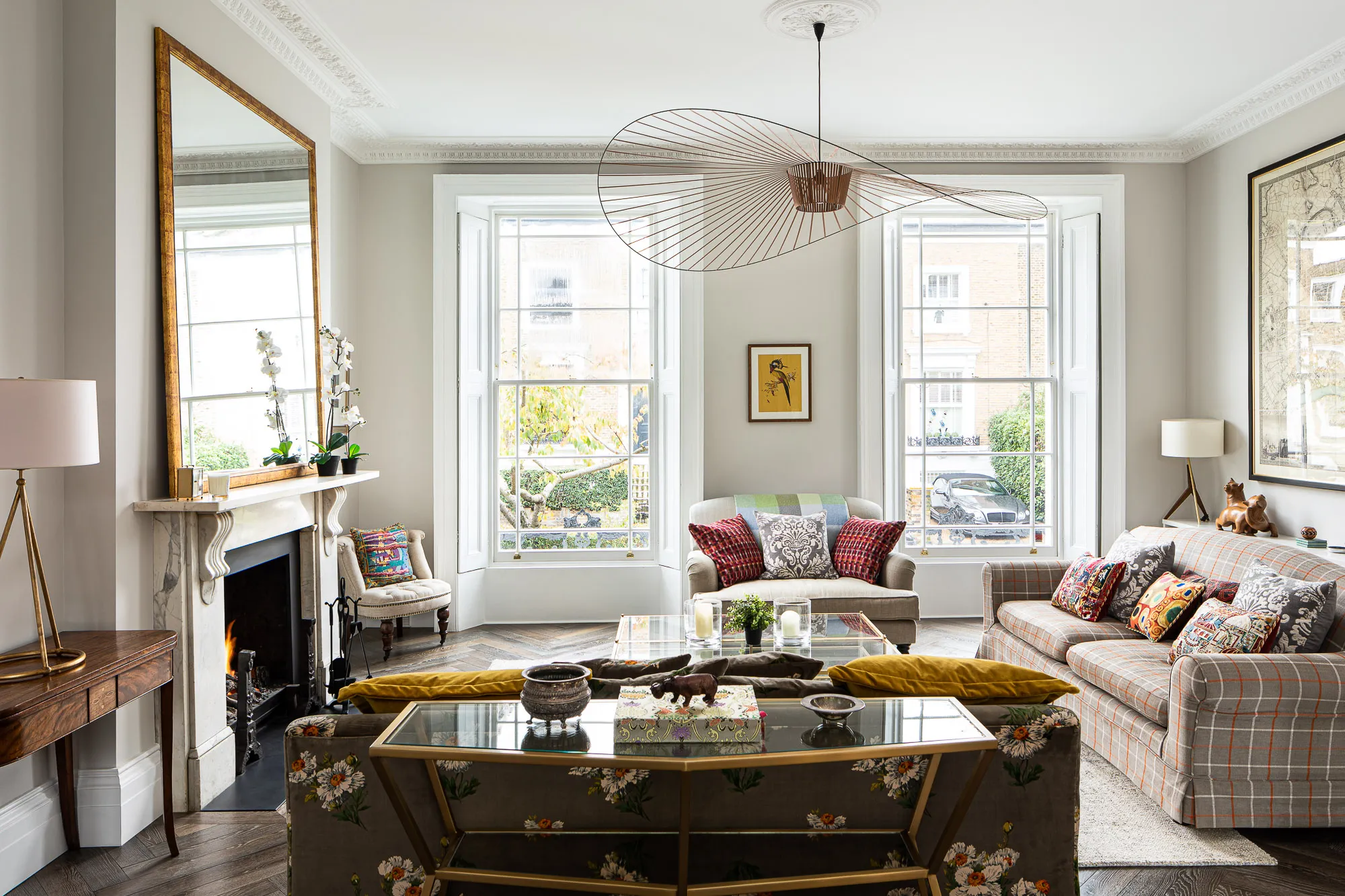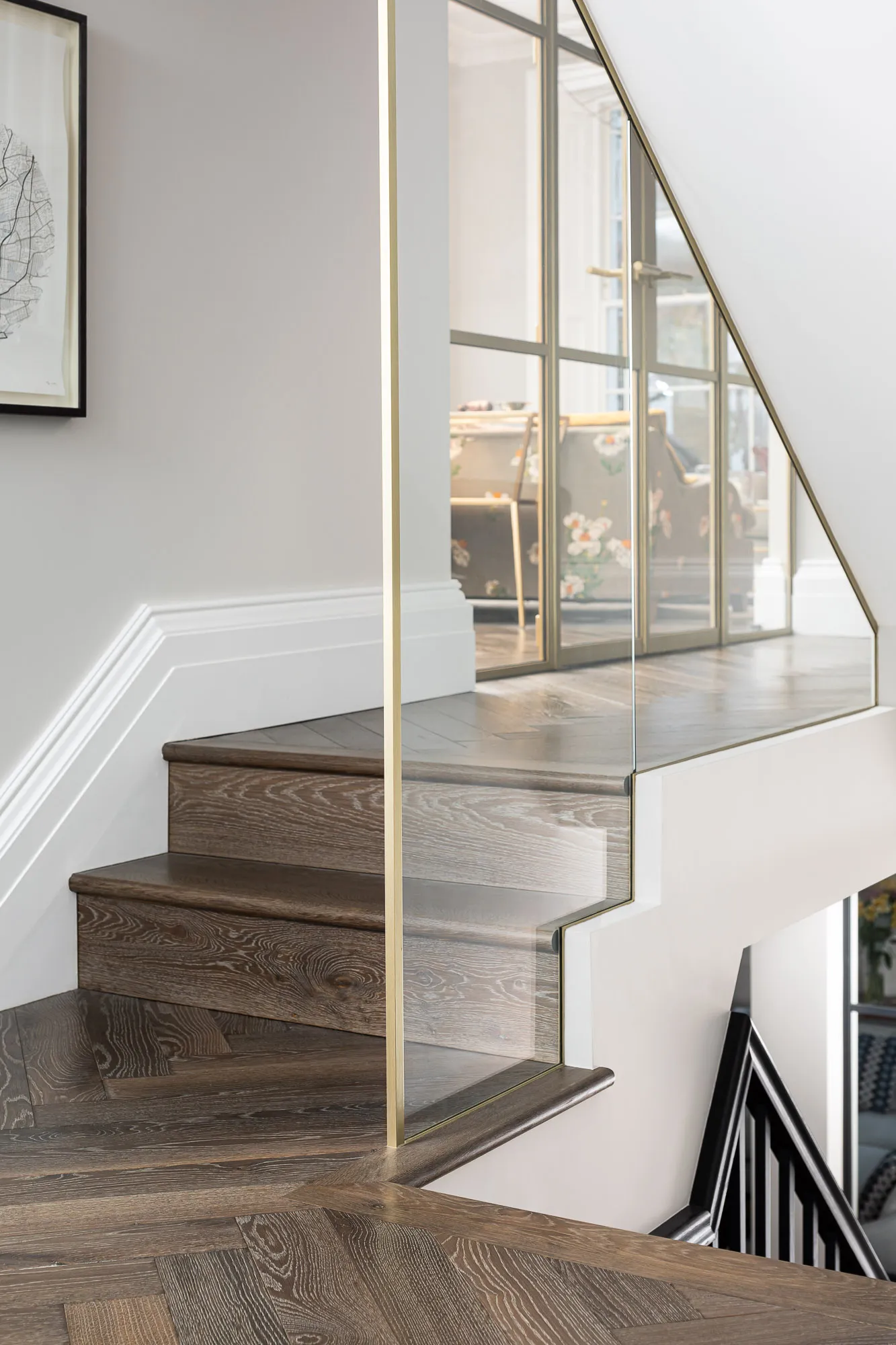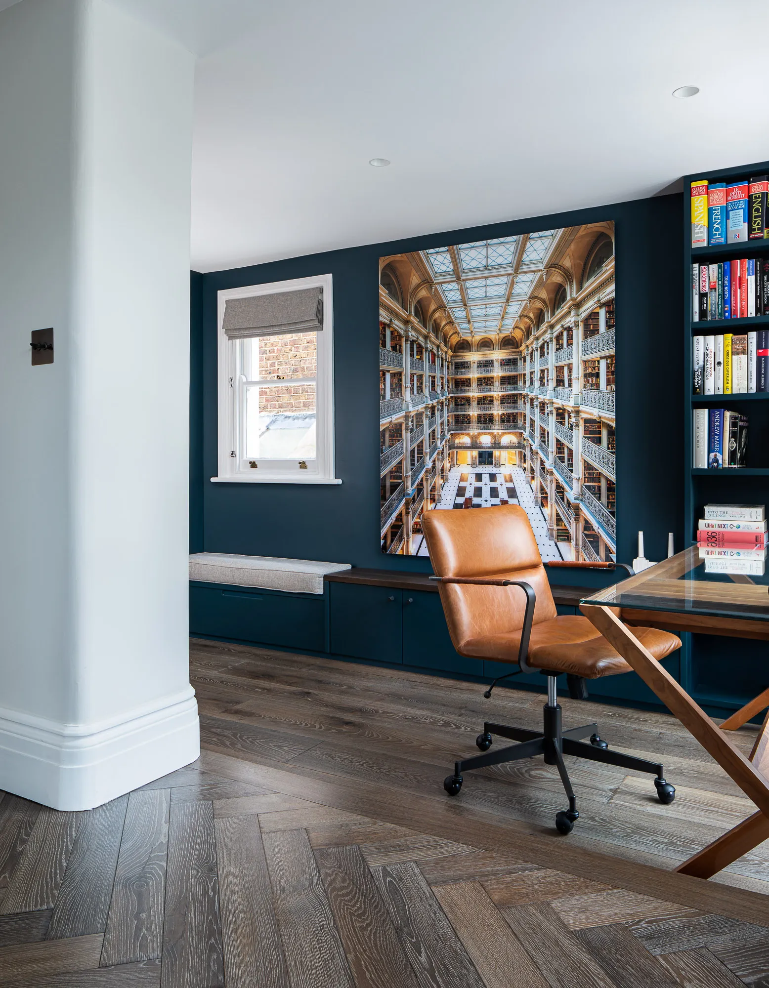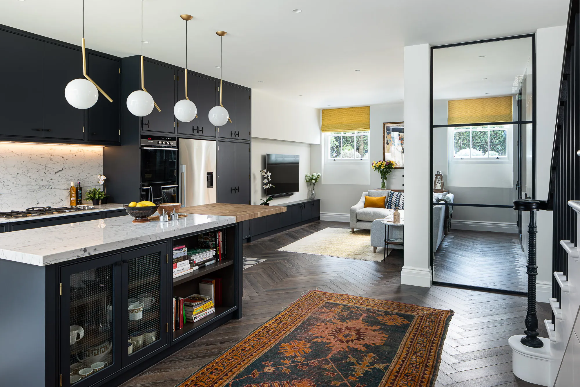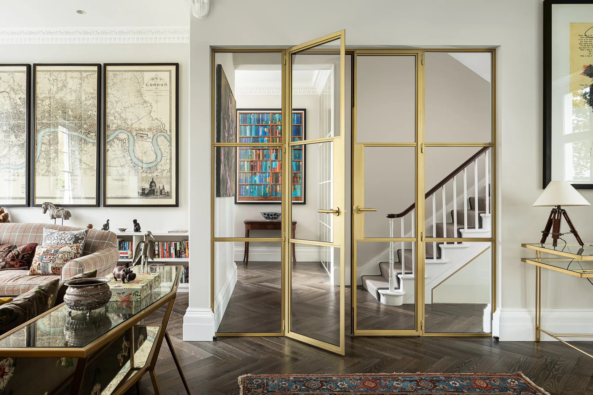 The upper ground floor was also reconfigured to improve circulation and storage. A new wardrobe in the entrance hall adds everyday practicality, while wide brass-framed Crittall doors redefine the living room. This partition functions both as a striking design feature and as a fire-rated division, balancing safety with elegance. At the rear, a small former utility space was converted into a bright home office with views over the landscaped garden — a serene retreat for work.